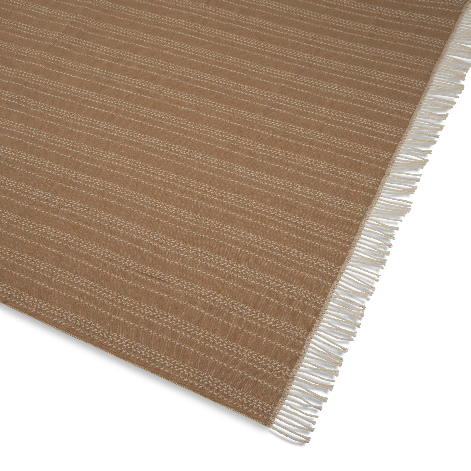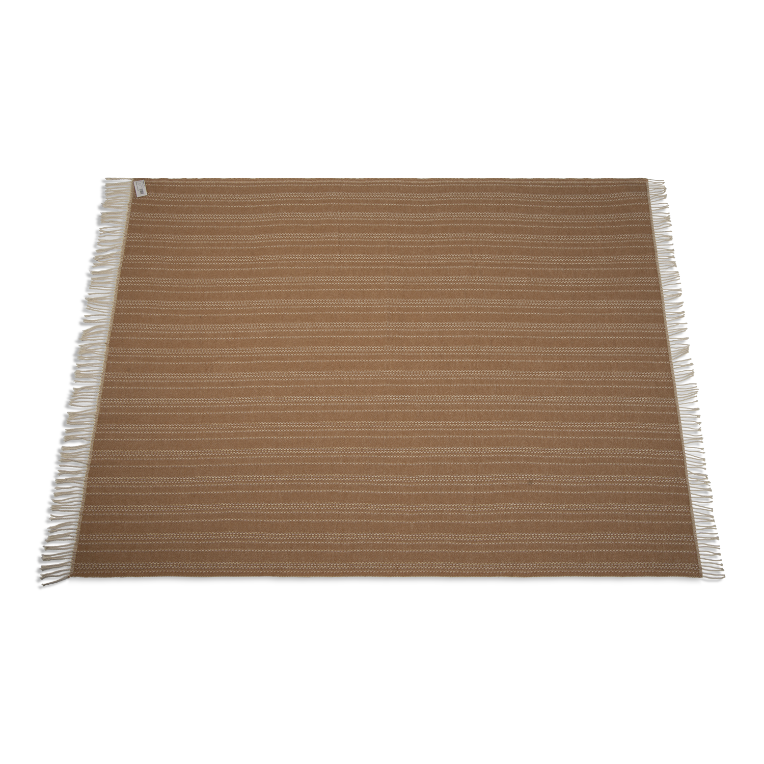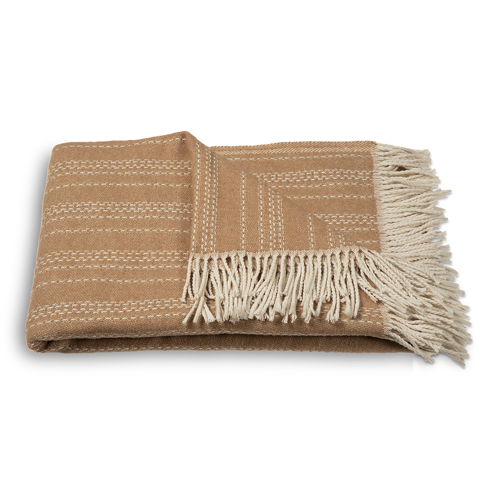 Plaid Ember in lichtbruin met elegante witte franjes aan de uiteinden geeft je interieur een warme en stijlvolle uitstraling. Met zijn afmeting van 150x200 cm is hij ideaal om lekker onder te kruipen of decoratief over de bank te leggen. De plaid is in Spanje vervaardigd uit een zachte mix van katoen, acryl en polyester en draagt het OEKO-TEX® STANDARD 100 label, wat garant staat voor een veilig en huidvriendelijk product. Wasbaar op 30 graden, praktisch in onderhoud én perfect om een knusse, gezellige sfeer te creëren in huis.