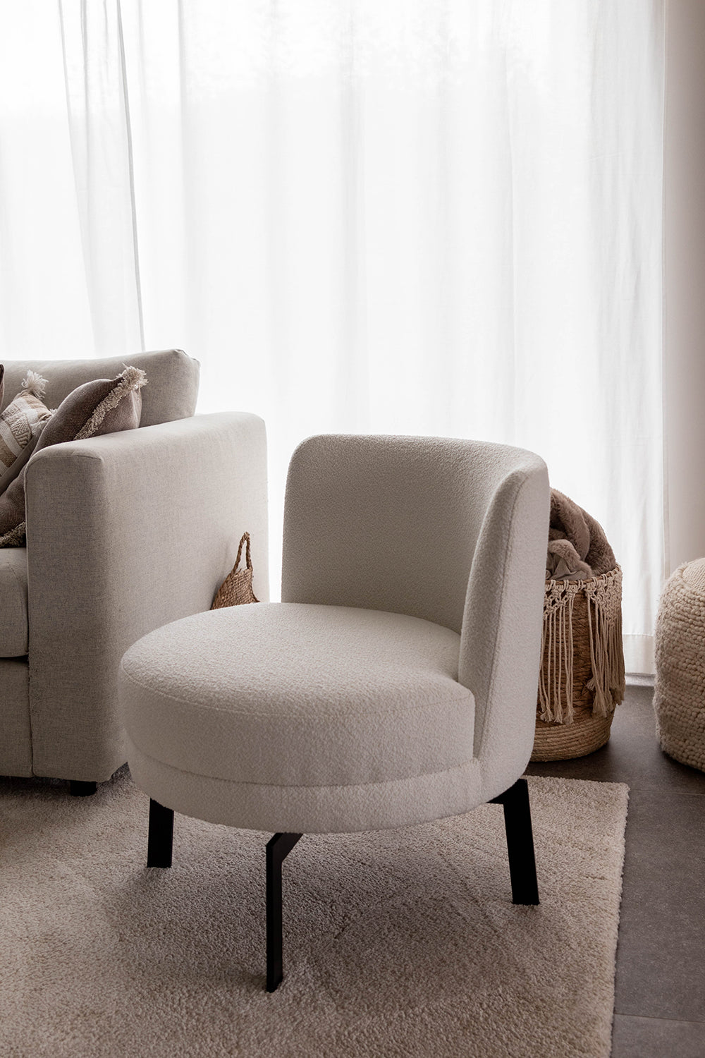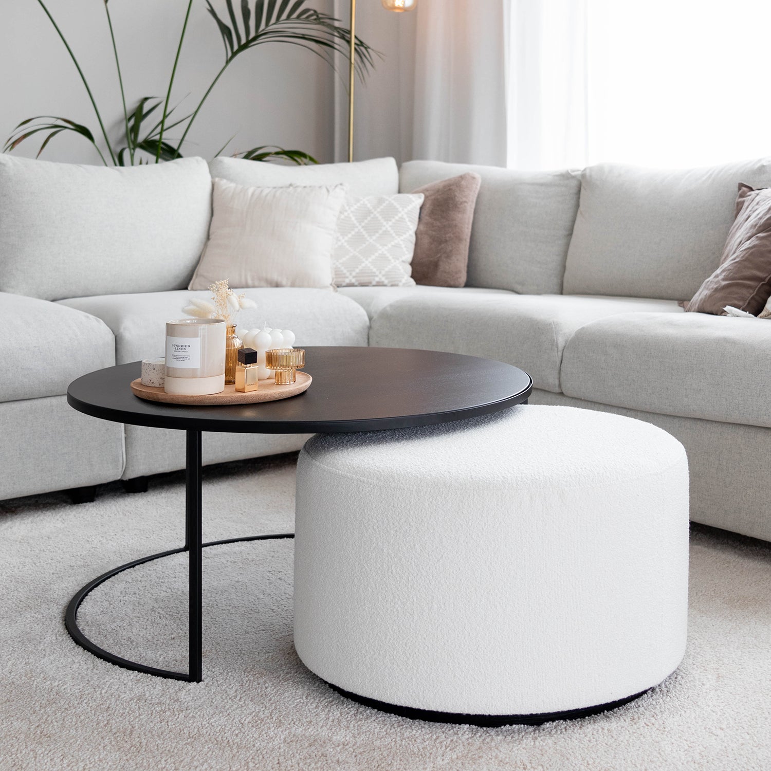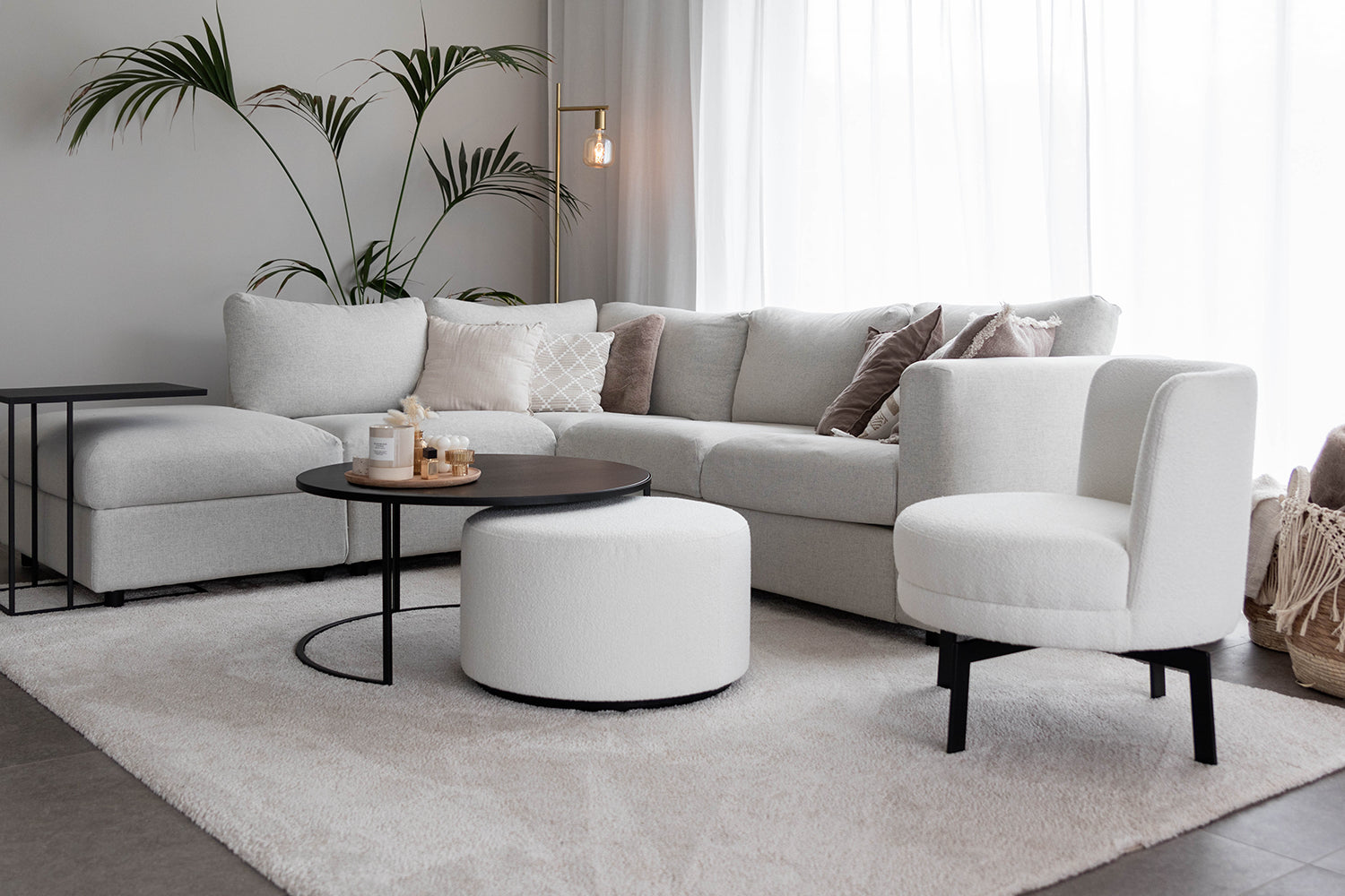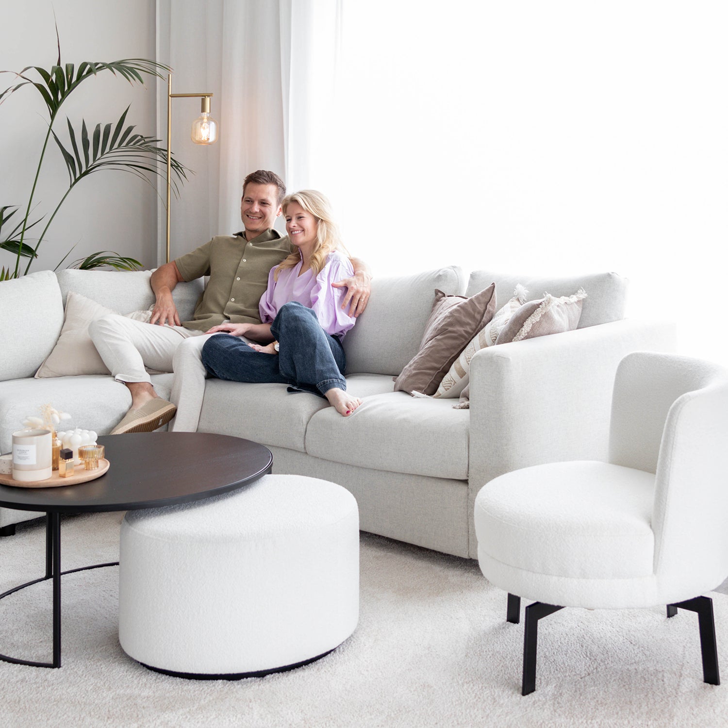 Jolien and Brecht, known from the television programme ‘Married at first sight’, have decorated their new home in Zottegem with stylish pieces from the Atmooz collection. The pendant lamp Hanoi, a striking piece, illuminates their interior and adds a touch of elegance. The organic mirror Stone XL brings a natural element to their home, while the round armchair Felix and Footstool Ritz, finished in Ivory fabric colour, create a soft and inviting atmosphere. The furnishings are completed by the floor lamp Thika and the side table Vanger, both of which contribute to the harmonious and sophisticated look of their living space. Celebrating their love for each other and their shared home, the couple have created a space that is both stylish and comfortable, a perfect reflection of their personalities and lifestyles.