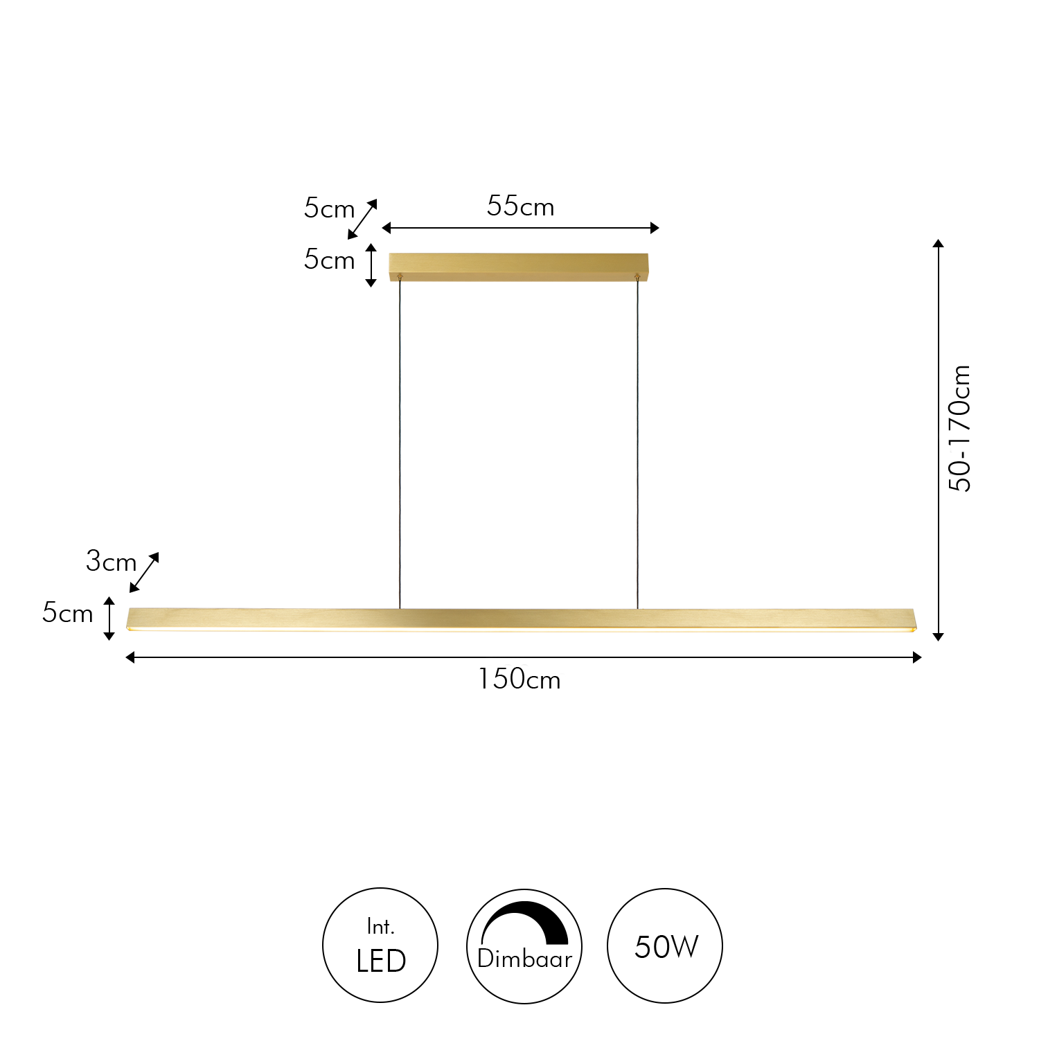 The Jasmin pendant lamp is a classy lamp with a brushed antique brass finish. The floating beam is 150 cm wide and is fitted with two black cables finished in high-quality linen. The cables can be adjusted to any desired length, making the lamp the perfect addition to any space. The Jasmin pendant lamp has an integrated LED which is dimmable, meaning you can adjust the atmosphere as you wish. The lamp emits light both in an upward and downward direction, creating an attractive distribution of light. The Jasmin pendant lamp is ideal for use above dining tables or desks, where you can enjoy its stylish finish and warm light.